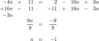 &&\dfrac{9n}{9}&=&\dfrac{-9}{9}&&&& \\ \\
