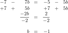 &&\dfrac{-2b}{-2}&=&\dfrac{2}{-2}&& \\ \\