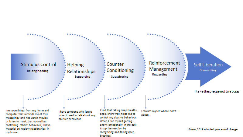 - Stimulus Control [Re-engineering] – I remove things from my home and computer that reminds me of toxic masculinity and I do not watch movies nor listen to music that normalizes controlling others’ behaviour; I have material on healthy relationships in my home.