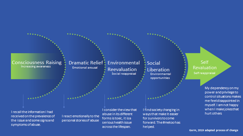 - Consciousness Raising [Increasing awareness] – I recall the information I had received on the prevalence of the issue and some signs and symptoms of abuse.