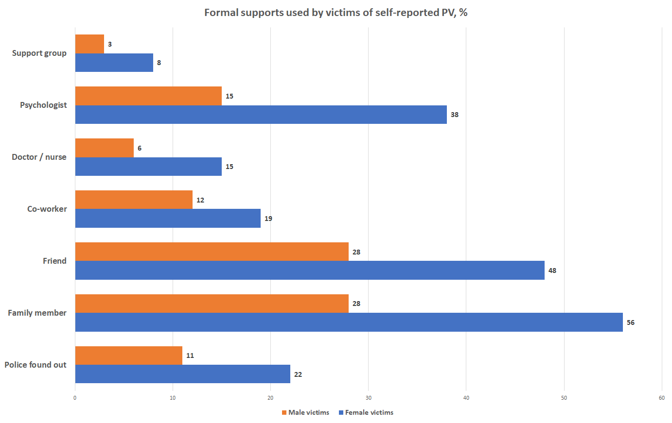The lack of services for male victims, or a lack of knowledge about them, are further barriers to male survivors seeking assistance. Although Gadd et al, (2002, p. vii) concluded that in Scotland no one, survivors or service providers, was making demands for male-specific services, nor even for shelters for men fleeing abuse, they also noted that “there is some evidence to indicate that abused men are not making full use of the pre-existing support services available to them, perhaps suggesting that some service providers need to publicize their remit more widely. This may also be because our society tends to still think of women as the victims and so abused men may not feel that they can access services which they perceive as primarily for women. See services available to men at the end of the chapter.Male survivors have similar challenges as females. They underreport and do not seek help because they feel embarrassed. They differ in that their embarrassment is from the societal belief that they will be seen to be less than (as a weak man) and seen as not able to handle women. This internalization of hyper-masculinity as a norm may be the cause of their embarrassment and underreporting. Male survivors also have chronic conditions similar to female survivors. Even though outcomes of intimate partner violence are similar between the gender groups, males are at a great disadvantage in relation to the use of formal support services. Figure 18.3 compares use of formal services by gender and it is clear that men access every service at a lower rate than women. Access to support services among men victims of intimate partner violence is, in some cases, over 50% lower compared to women. Also, there are significant differences among family members and friends who seem to be more supportive of women than men victims (Lysova et al., 2019).
