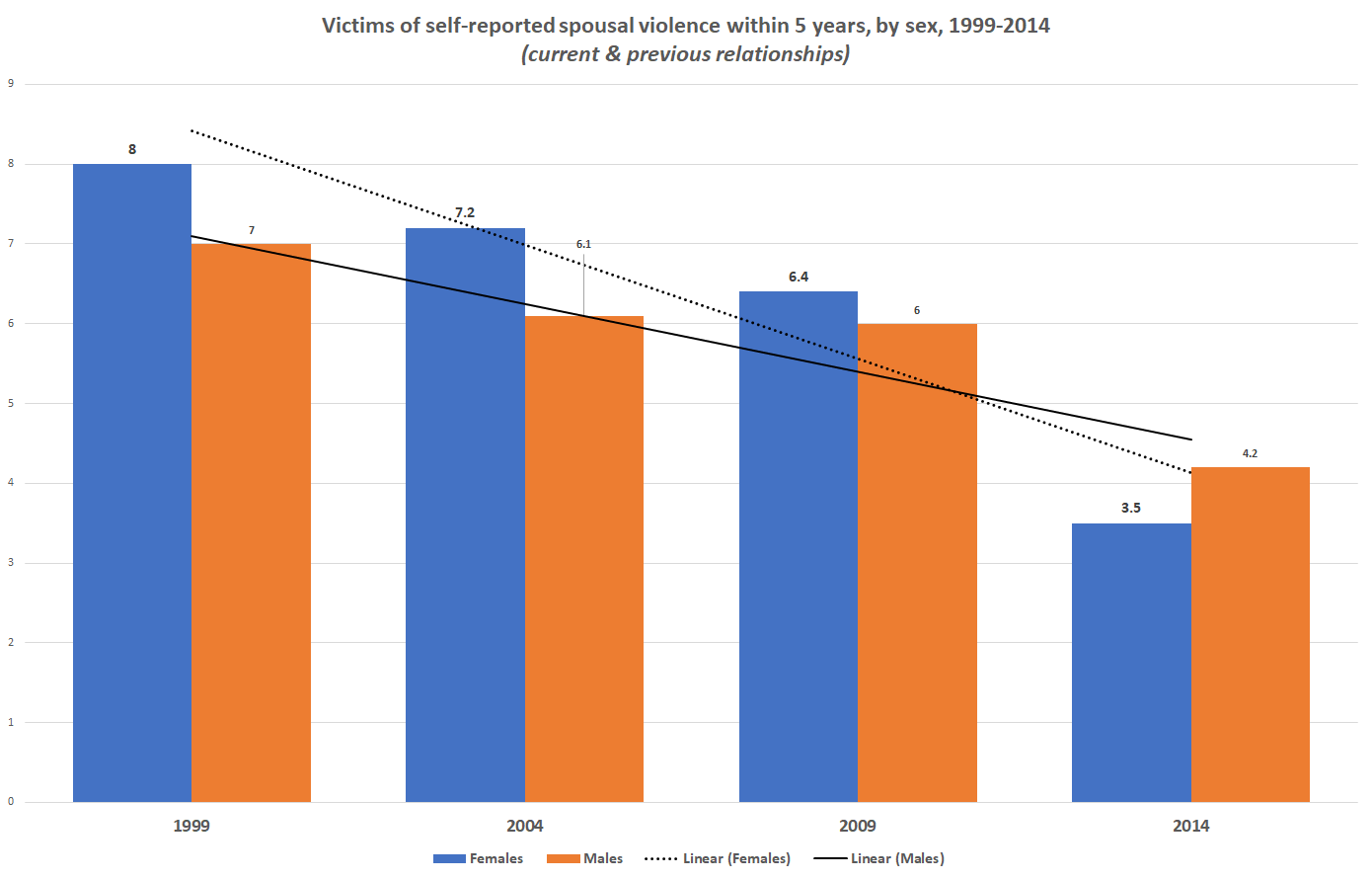 Statistical analyses have their place and they reveal important information. However, researchers have to be cautious with selective bias. What is essential is that innocent people are being abused, traumatized, and need healing. Additionally, all perpetrators must be identified, held accountable and provided with the resources to help understand and address the behaviour. Issues related to identifying, recognizing, and providing appropriate support to male victims are observed in the graph below (Lysova et al., 2019). As studies and support services seem to be effective in reducing cases of relationship violence among women, male victims do not receive the same support. Intimate partner violence among men decreases at a slower rate suggesting important gaps in the knowledge and strategies to address violence among this population group. This slower decrease may be because men do not report and there are not many services specific to male survivors (as shown in Figure 18.2).