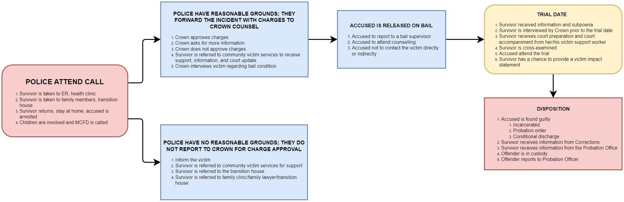 In the first RV participatory action cycle (Gurm et al., 2013) the first item of business was for service providers in the anti-violence sector to identify the steps that occur when a survivor calls the police for assistance.