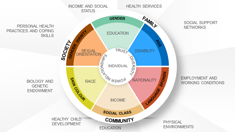 Practicing cultural safety ensures that health care staff (all service providers) are respectful of nationality, culture, age, sex, sexuality, political and religious beliefs, and the position of their clients. Awareness of these intersecting systems has the potential (consciously or unconsciously) to influence the power balance between clinicians (service providers) and patients (recipients of care), as well as between colleagues. In nursing, cultural safety is understood to mean there is no damage or harm by interactions between people, and that dignity and respect are maintained for all parties in an interaction (BC College of Nurses and Midwives [BCCNM], 2024). Creating a culturally safe environment requires practitioners to have cultural humility. It requires self-reflection on personal oppression and privilege as well as identification of biases and to create respectful partnerships based on trust. It is about creating equity in partnerships that is consistent with the concept of social justice.