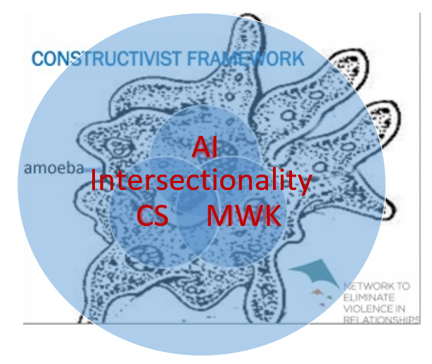 At all meetings, the model on the left (Figure 6.4) is integrated by NEVR. In the constructivist framework, Cultural Safety (CS), appreciative inquiry (AI), Multiple ways of knowing (MWK) and Intersectionality theory interact and are constantly changing to address RV. We imagine NEVR similar to an amoeba system. Just like an amoeba changes its shape, so does NEVR because the committee is constantly evolving as it interacts with members (i.e., internal environment) and organizations/policies/law/allies (external environment). Each member has multiple roles and identities that interact to provide innovative perspectives and understandings (intersectionality). The committee values all members’ ideas because it believes in multiple ways of knowing (MWK) creating equal power and trust which in turn results in cultural safety (CS). NEVR focuses on its mission (i.e., dream) of eliminating relationship violence and not on the statistics of today (AI). The facilitator ensures each individual at the meeting is respected and provided an equal opportunity to voice their opinion, and the decisions are made from an inclusion perspective. From the cultural safety perspective when working with survivors, one of the goals is to ensure no harm is done to the service provider, and their specific current situation and any historical oppressions are considered. Although originally developed to work with individuals, cultural safety applies to groups, organizations, and communities. Emphasis is placed on the desires of the service provider, and where they are positioned in terms of family, workplace, and community roles and dynamics. Also, it is acknowledged that interactions are dynamic, constantly changing like the amoeba in the figure. It is recommended that this approach be carried out in all collaborations between individuals and organizations and when working with survivors and perpetrators.
