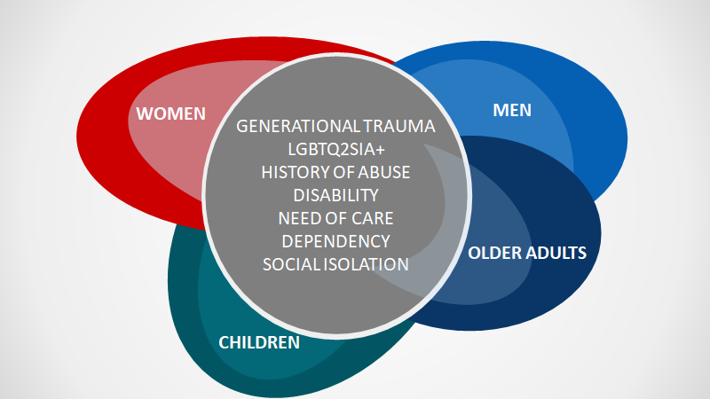 In our literature review of Canadian studies, certain populations are identified as more vulnerable than the general population to RV; for instance, Indigenous, Northern and Remote Communities, children, older women, LGBQT2SIA+, immigrants and refugees, those who live with an impairment or disability  (Jeffrey et al., 2018), low socioeconomic status (SES), low education, dependency, low control, oppression, witnessed abuse, suffered abuse or maltreatment (CDC, 2019). As well, the most severe form of RV like death is 4.5 times higher among women versus men. In addition, children considered one of the most vulnerable groups, face an extremely high risk of death, for they may be killed in a variety of situations including revenge or crossfire (Jeffrey et al., 2018). Although some groups might show higher risk depending on social situations, there is a great overlap in risk factors between groups. While much of the literature and our later chapters focus on each group across the lifespan separately, in this chapter we focus on bringing together the risks and successful initiatives and apply an integrative model. See chapter 15 for details about RV against women, chapter 16 for children, chapter 17 older adults, chapter 18 for men, chapter 19 for Indigenous populations, chapter 20 for LGBQT2SIA+, chapter 21 for immigrants and refugees, and chapter 22 for workplace violence.